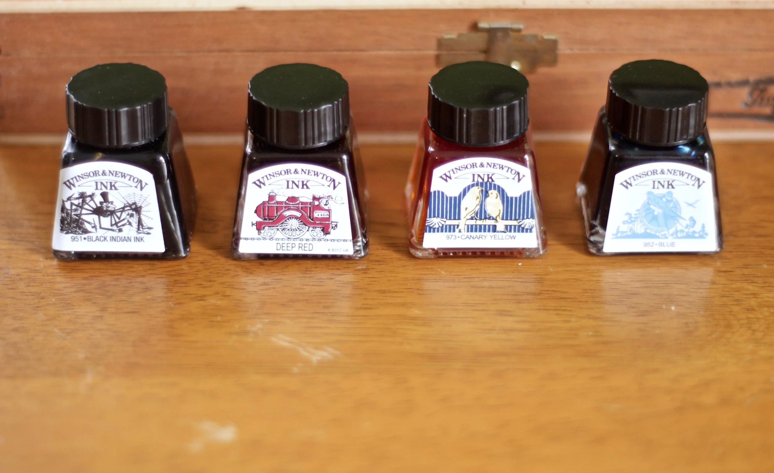 Windsor & Newton illustration inks from my mother. Black, red, yellow, & blue. I've not used them very much, but I'd like to do some experimenting. I think I need some eyedroppers first, though, so I can be very methodical about my ink to water ratios.